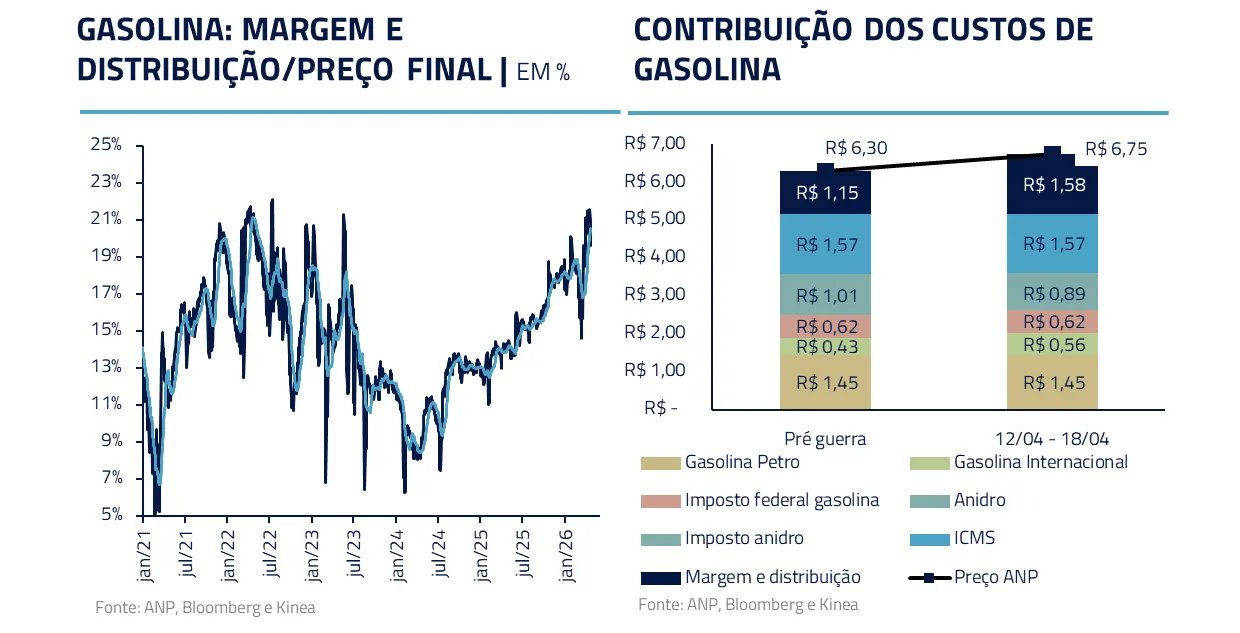 A outra parte da surpresa decorre já de efeitos da guerra. Mesmo sem reajuste da Petrobras, o preço da gasolina ao consumidor tem subido mais do que o preço do importado sugeriria. Levando, assim, as margens da distribuição às máximas recentes.