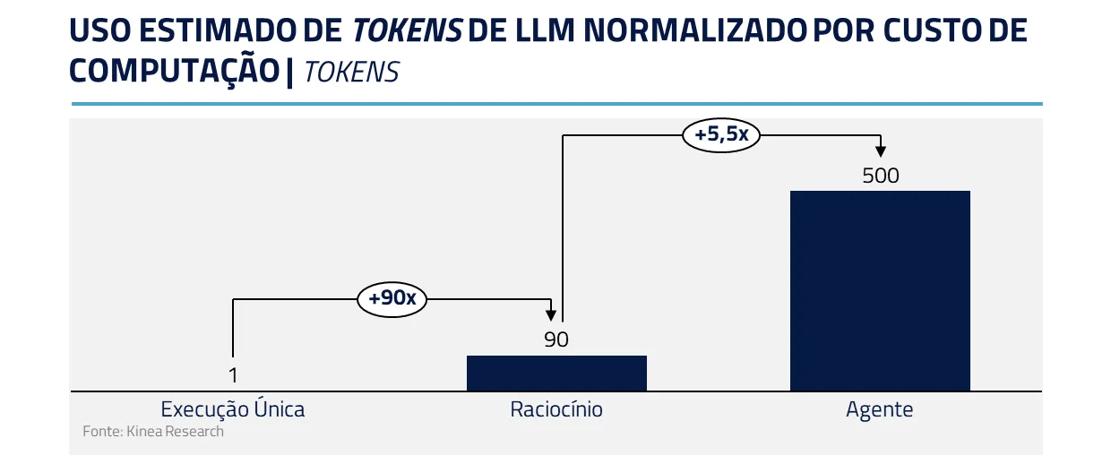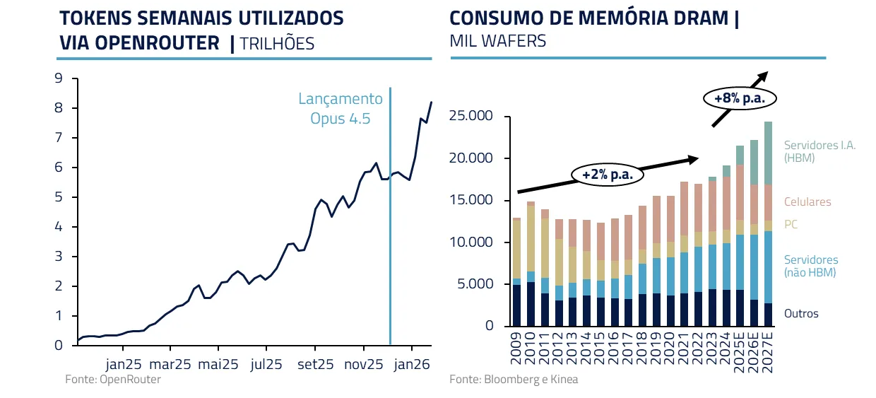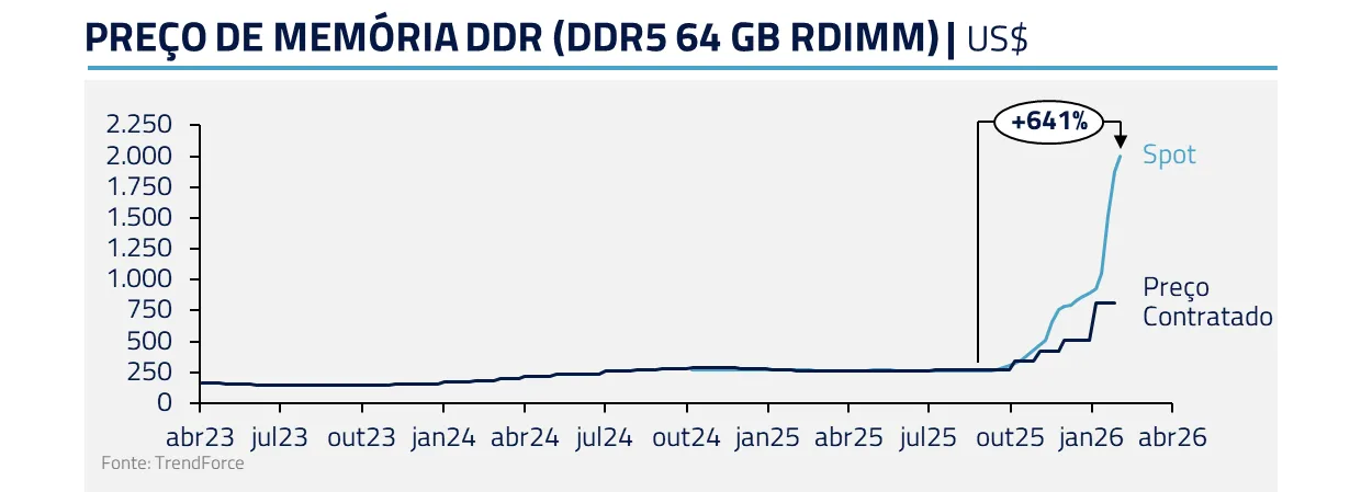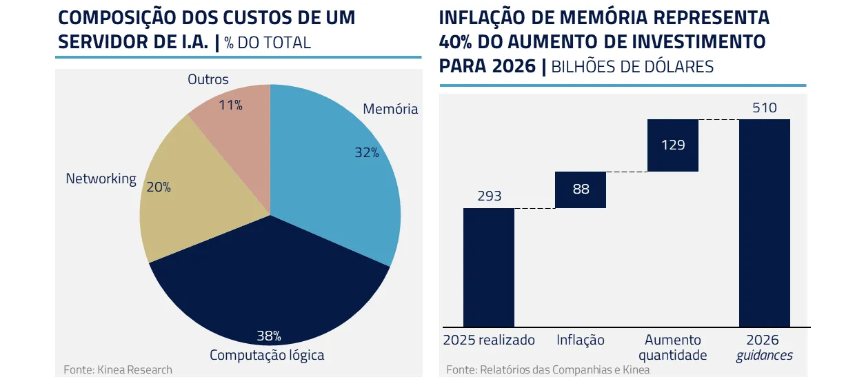 Parte significativa desse aumento vem do repasse dos custos de memória na produção de servidores de I.A. Como memória representa cerca de 30% do custo de um servidor, estimamos que aproximadamente 40% do crescimento de investimento em 2026 seja explicado pelo aumento de custo de memória.
