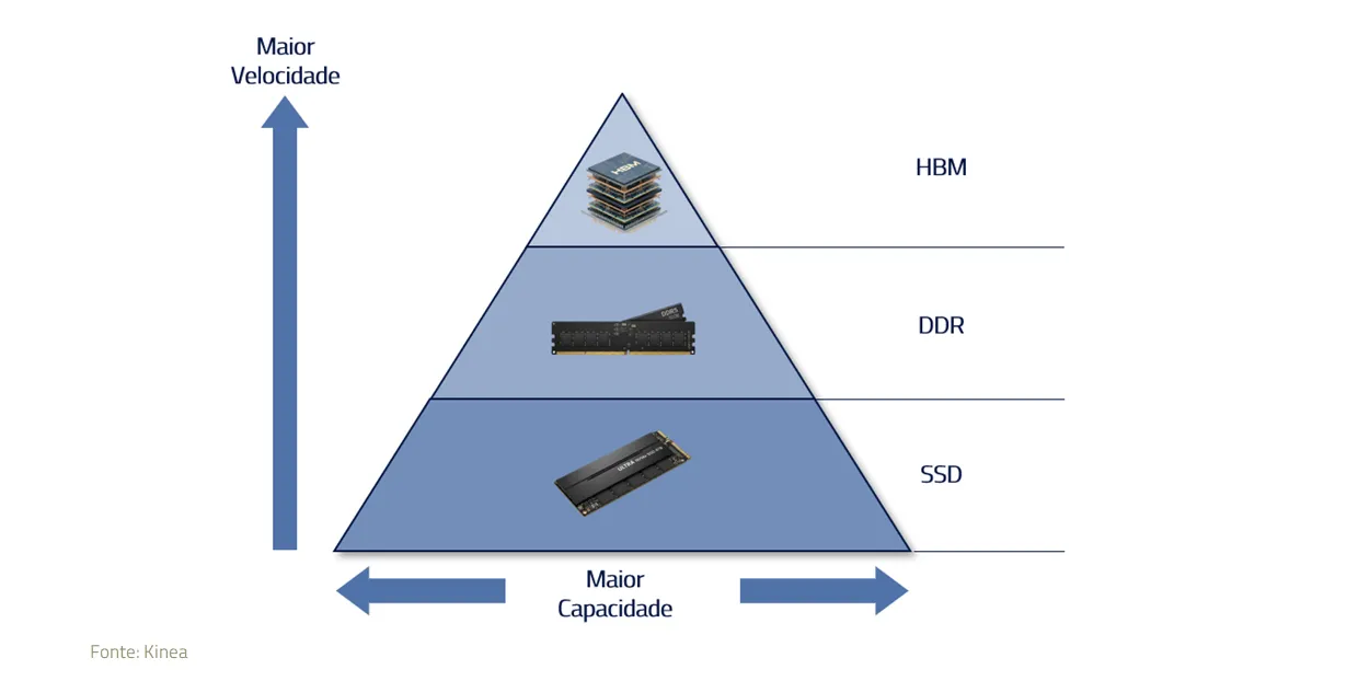 Dentro de cada categoria, nem toda memória é igual. As memórias possuem uma hierarquia de velocidade de resposta e capacidade de armazenamento: HBM são como os rabiscos à vista de Leonard Shelby, alta velocidade de acesso, mas pouca capacidade de armazenamento; DDR são como as fotos da Polaroid, velocidade média e capacidade moderada; e NAND/SSD como tatuagens/dossiês, baixa velocidade para escrever, mas grande capacidade e persistência.