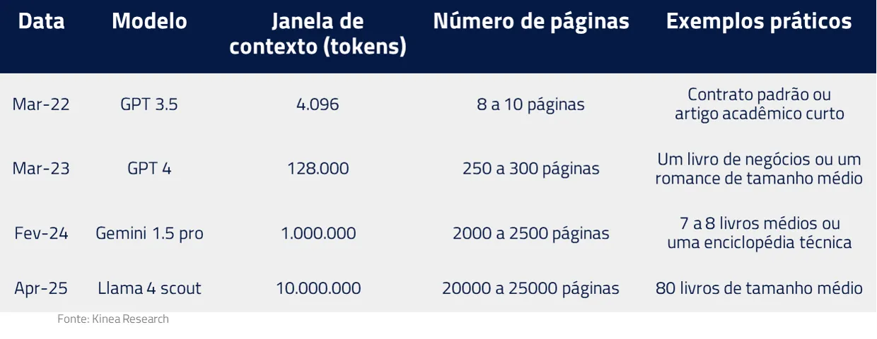 A cada nova geração de modelos de I.A., a quantidade de informação que o modelo consegue lidar – a janela de contexto – vem aumentando. Isso é necessário para resolver tarefas reais, que demandam mais histórico e etapas de raciocínio, e acabam exigindo, consequentemente, mais memória.