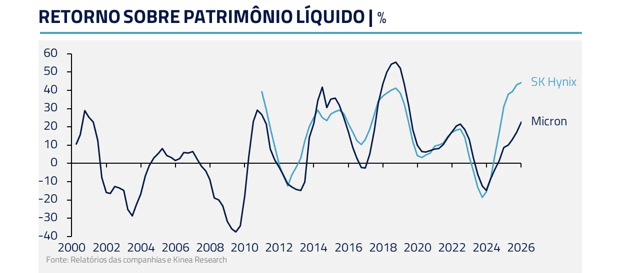 Por isso, acreditamos que, desta vez, o setor pode sustentar retornos e múltiplos estruturalmente acima do padrão que o mercado projeta. Se antes a volatilidade dos ciclos destruía retornos, agora o risco é subestimar a duração e a intensidade deste ciclo. Continuaremos a monitorar de perto eventuais mudanças nesse cenário.