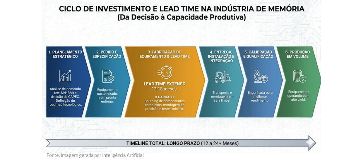 A produção de chips de memória avançados depende de equipamentos complexos, com prazos de entrega acima de 12 meses, e de ambientes fabris especializados, cuja construção leva cerca de 2 anos.