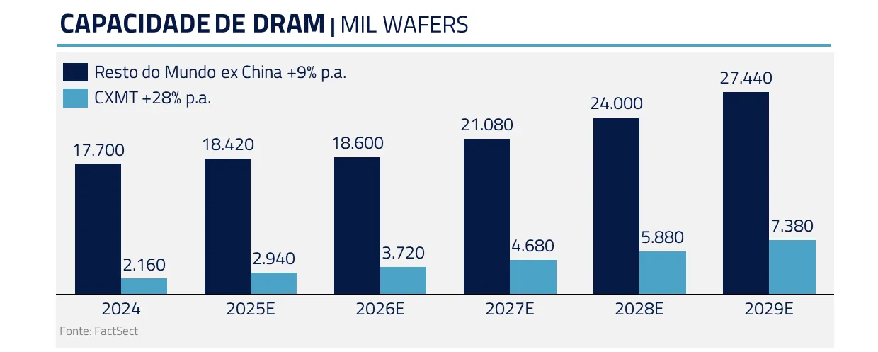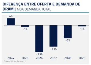 Isso significa que expandir capacidade fabril ou reconfigurar linhas para tipos diferentes de memória é um processo que exige planejamento e prazos estendidos. Com isso, estimamos que apenas em meados de 2028-29 o setor reencontrará o equilíbrio entre oferta e demanda.