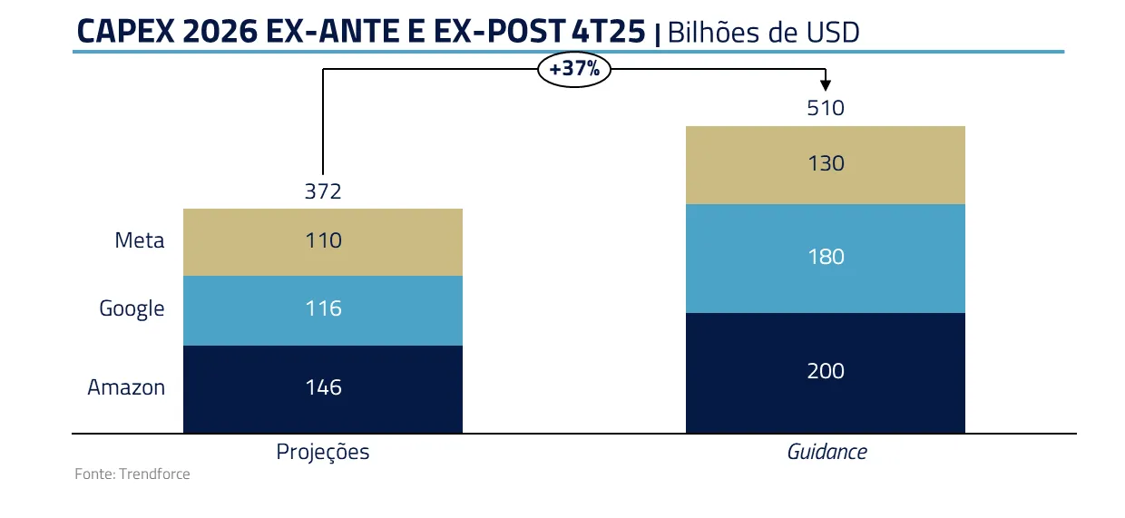 O reflexo da inflação de memória nos últimos meses começou a aparecer nas projeções de resultados das Big Techs. Para 2026, Google, Amazon e Meta projetam investimentos conjuntos de US$510 bi para 2026, um número bem acima do esperado antes da divulgação de resultados.