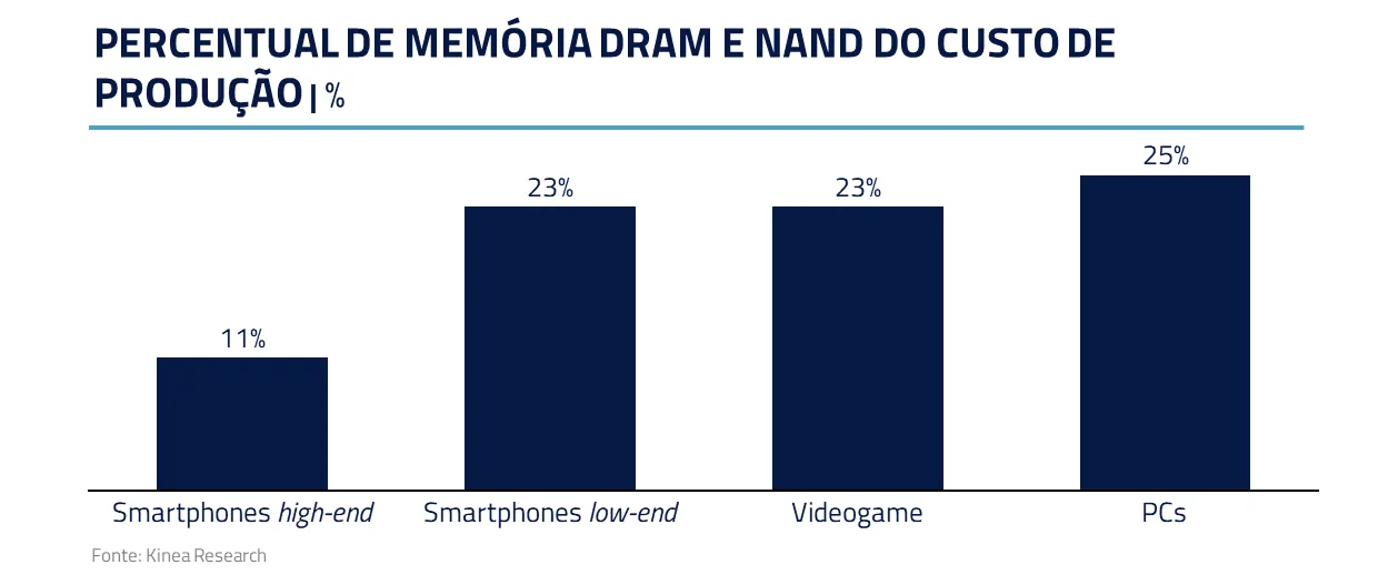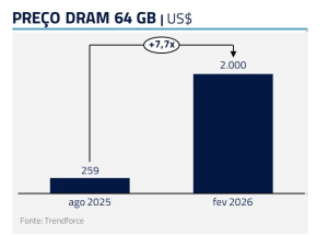 Em segmentos de menor valor agregado, como celulares de entrada, margens apertadas impõem repasse direto de custos, e, além de uma esperada redução da capacidade de memória dos aparelhos, devemos observar quedas de volumes de produção em 2026.