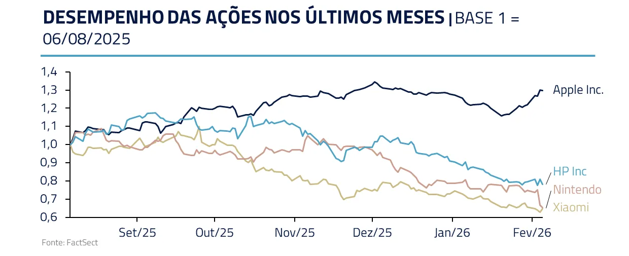 Os preços das ações já refletem essa preocupação. Até a Apple, grande compradora de memória, sinalizou dificuldades para 2026, mencionando aumentos de cerca de 100% no preço de memória e possível falta do insumo.