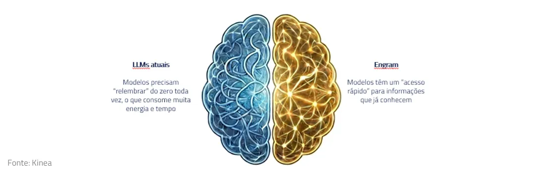 A DeepSeek, recentemente, propôs uma nova arquitetura para o uso de memória nos modelos, chamada Engram. Inspirada no funcionamento do cérebro humano, a ideia é separar fatos e raciocínio. Em vez de gastar HBM decodificando termos óbvios, o modelo consulta a memória factual em DDR e responde, reservando a HBM para quando houver necessidade de raciocínio de verdade.