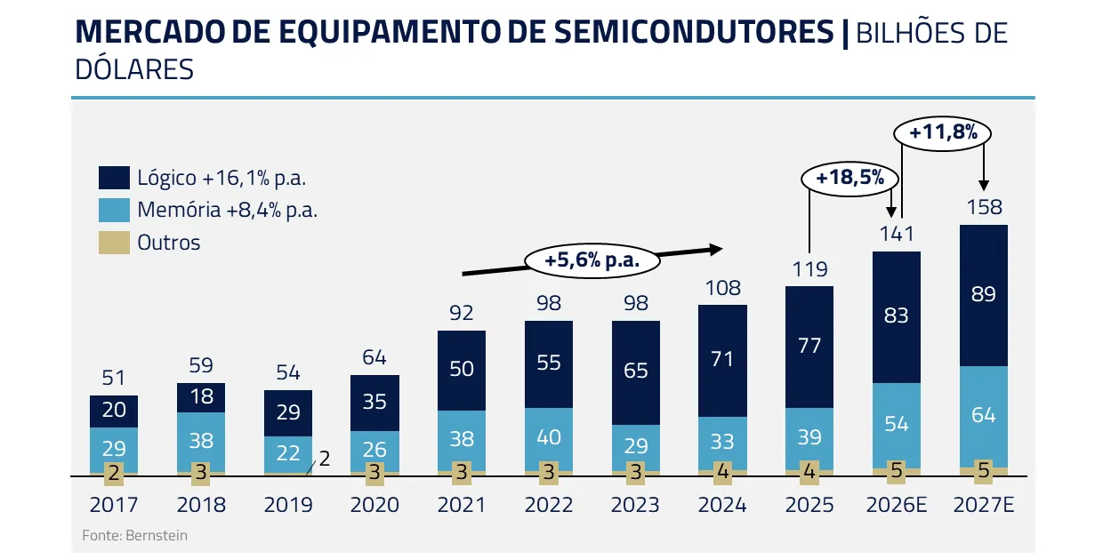Também vemos oportunidades nas empresas fornecedoras de equipamentos para fabricação de memória (semicaps). O mercado dessas empresas deve ganhar tração conforme a I.A. e os datacenters demandem mais semicondutores. O mercado já começou a revisar para cima as perspectivas dessas empresas para os próximos anos, refletindo maior investimento em lógica avançada e memória.