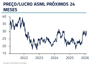 Preferimos atualmente investir na ASML, empresa de maior valor agregado e diferencial competitivo: é líder em litografia, etapa que “desenha” o chip com luz ultravioleta. O múltiplo atual, de preço/lucro 27x, em linha com média histórica, não reflete o ambiente único de demanda. Vemos espaço para tanto volume quanto preços mais favoráveis.