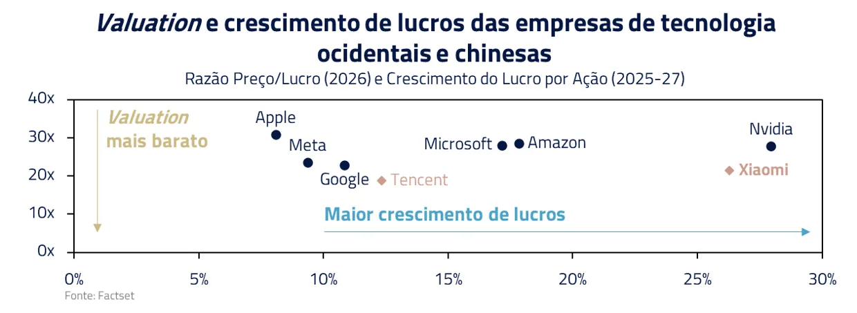 A valorização de cerca de 35% das ações de internet chinesas em 2025 foi sustentada pela convicção de que o país se tornou um polo de I.A. e pela percepção de que os valuations seguem descontados, negociando cerca de 12 vezes os lucros, contra 22 do S&P 500.