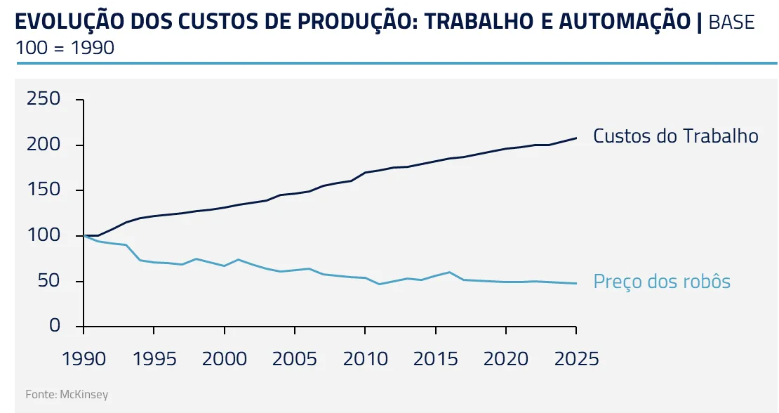 Em um contexto em que o custo do trabalho tem subido com a escassez de mão de obra e o custo dos robôs industriais caído, a robotização se apresenta cada vez mais como uma saída. De acordo com estudo de Acemoglu e Restrepo, um robô a mais a cada mil funcionários reduz os salários em 0,42%, evidenciando que mais robôs significam maior economia de custos de trabalho.