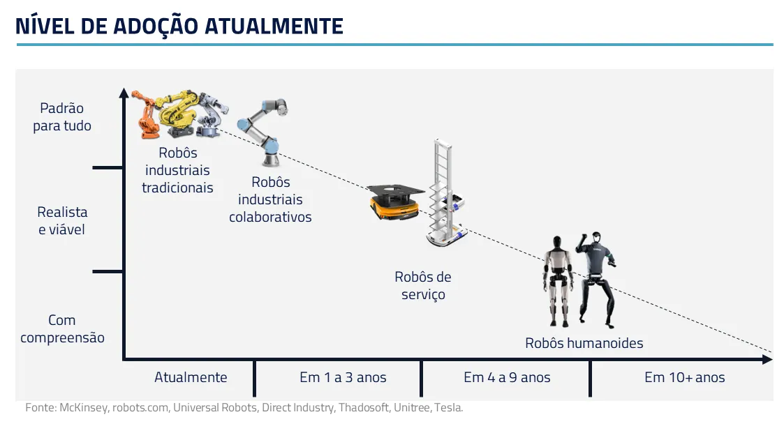 As estimativas ainda variam muito, dado o estágio inicial da tecnologia. Há estimativas de até 5 trilhões de dólares, quando se considera 1 humanoide para cada 2 pessoas. Esse é um cenário possível, mas fato é que mesmo adotando estimativas mais comedidas, a oportunidade já seria enorme, embora esteja distante.