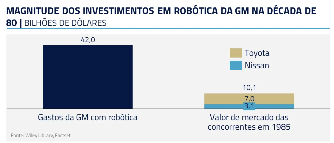 A automação industrial acelerou nas décadas seguintes, só a GM gastou mais de US$ 40 bilhões nos anos 80, boa parte em robotização. Com esse valor, ela poderia ter comprado Toyota e Nissan e elevar sua participação de mercado de 21% para 40%, mas sua opção de investir em robôs levou a apenas ganho de 1 ponto percentual. Fiascos como esse, e a planta de Hamtramck (1988) — com robôs quebrando vidros e “pintando uns aos outros” — expuseram o nível de imaturidade da indústria no Ocidente, e a seguir vimos o início da era da automação asiática.