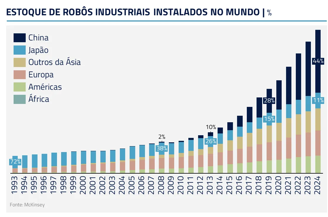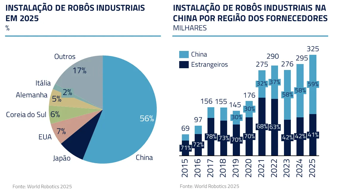 A China também avançou no setor. Em 2015, lançou o programa Made in China 2025, em que criou instrumentos financeiros para acelerar a autonomia da tecnologia no país. Nesse programa, a robótica foi um dos dez pilares estratégicos. Com isso, hoje, além de o país instalar mais unidades do que todo o resto do mundo somado, verticalizou sua indústria e conta com quase 60% desses equipamentos de fábricas locais.