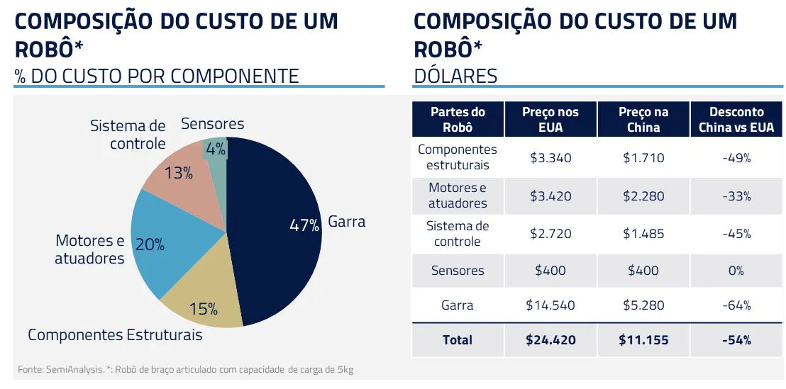 Além disso, a China também controla a mineração e processamento de minerais de terras raras, que são primordiais para a produção de diversos componentes na produção dos robôs, além de outros setores estratégicos como semicondutores em geral e defesa. Como consequência da escala e verticalização, o preço médio de um robô chinês atualmente custa menos da metade que nos EUA. O resultado é um país que deixou de ser importador de robôs e caminha para a autossuficiência da tecnologia.
