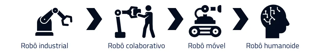 Ao longo das revoluções industriais, a trajetória tecnológica desses equipamentos também evoluiu: saímos de robôs industriais tradicionais, passamos para os atuais robôs colaborativos e móveis e, agora, começamos a entrar na era dos robôs humanoides — direção antecipada por Asimov.