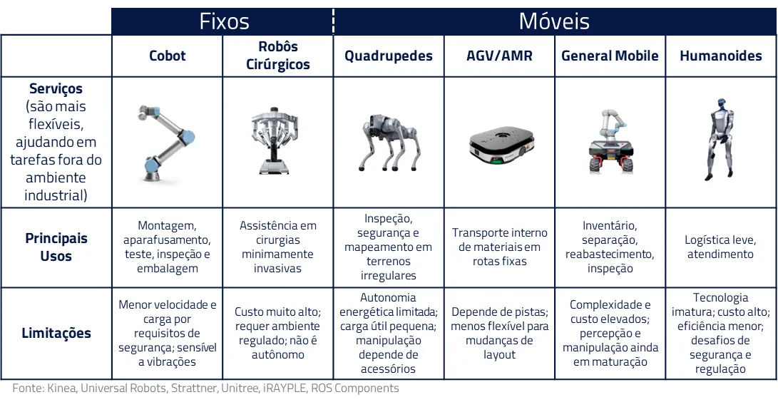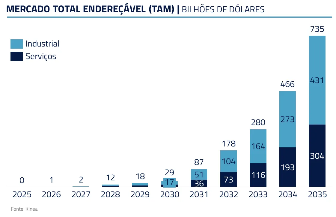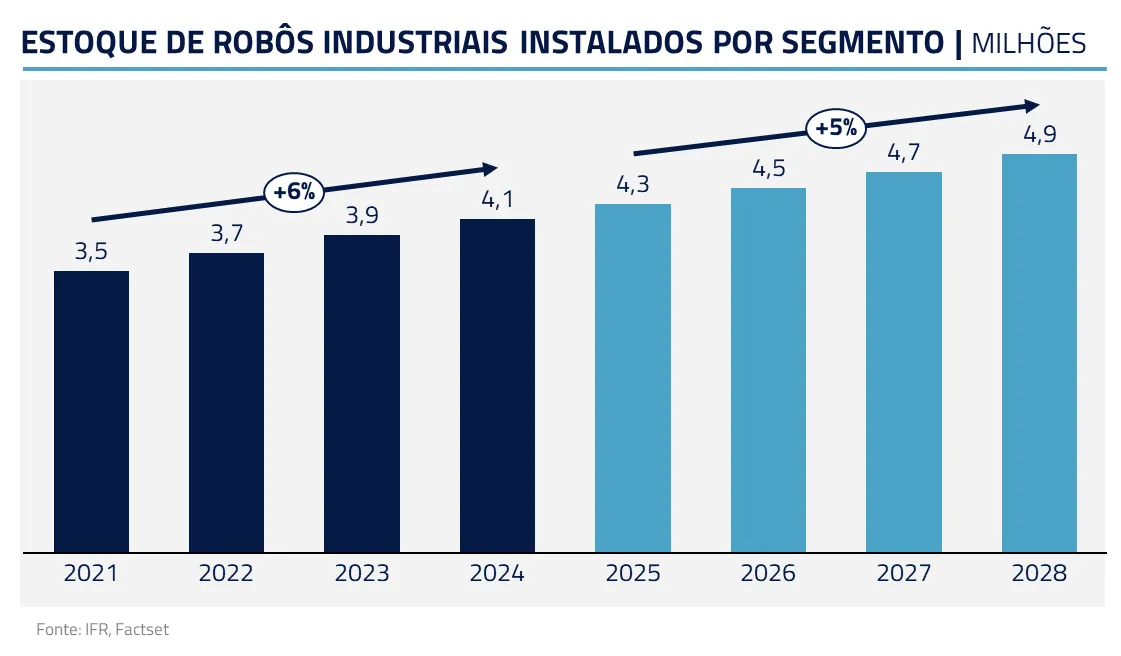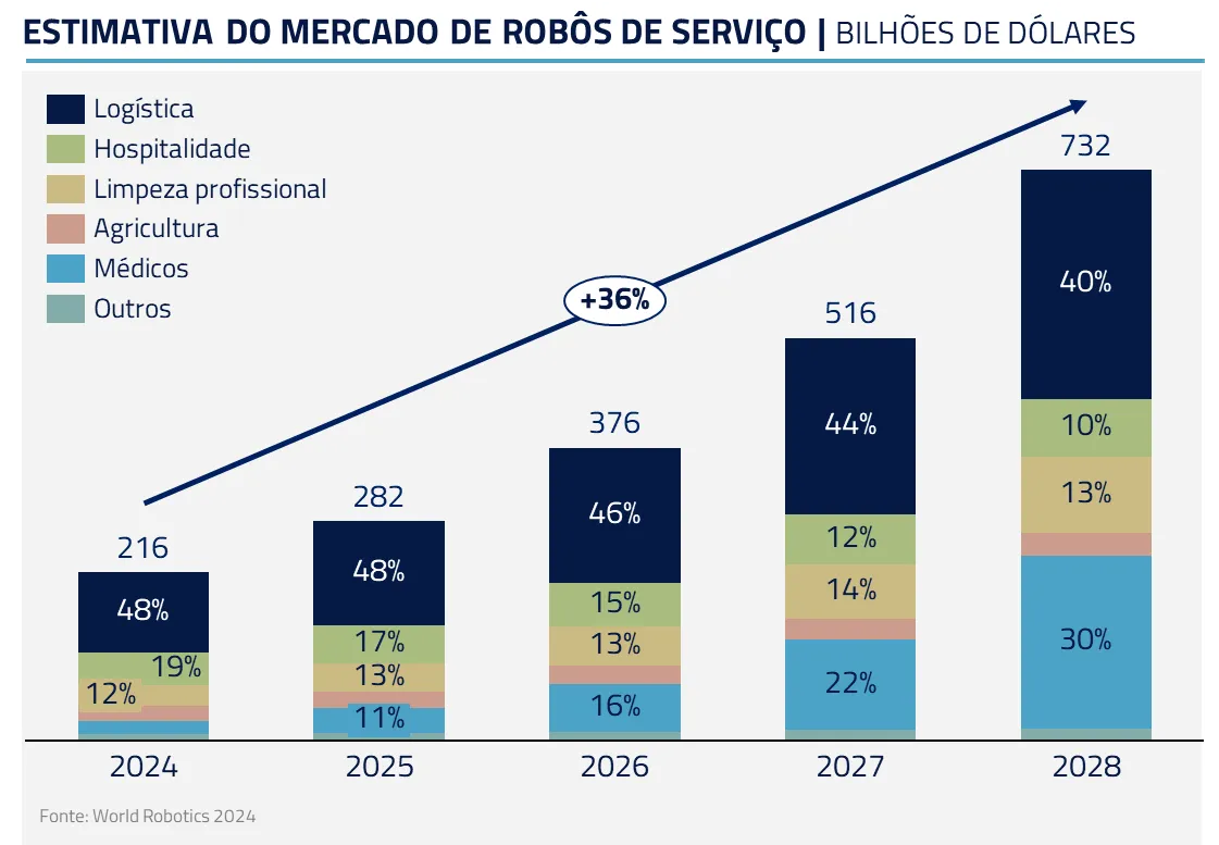 Para ter uma ideia do tamanho dessa oportunidade, dividimos em duas aplicações principais: industrial e de serviços. No segmento industrial, de acordo com a IFR, há 150 milhões de trabalhadores. Já em serviços, projeções da McKinsey indicam haver 185 milhões de funcionários em funções passíveis de automação — excluindo ocupações como psicólogos, artistas e gestores de pessoas.