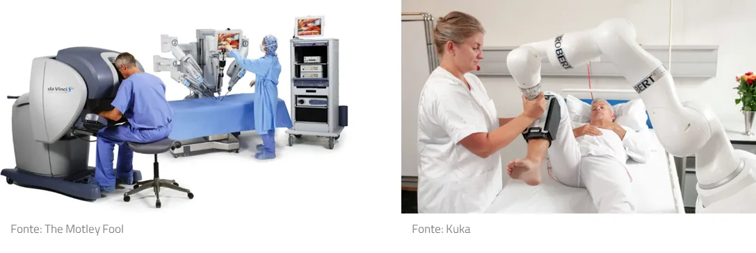 A medicina é outro segmento relevante para robôs colaborativos. Equipamentos como o Da Vinci da Intuitive Surgical, por exemplo, funcionam como uma mão mais precisa para cirurgias minimamente invasivas e têm tido alta demanda. Outro exemplo são os robôs de reabilitação e fisioterapia, que movimentam membros humanos com segurança e sensores de força.