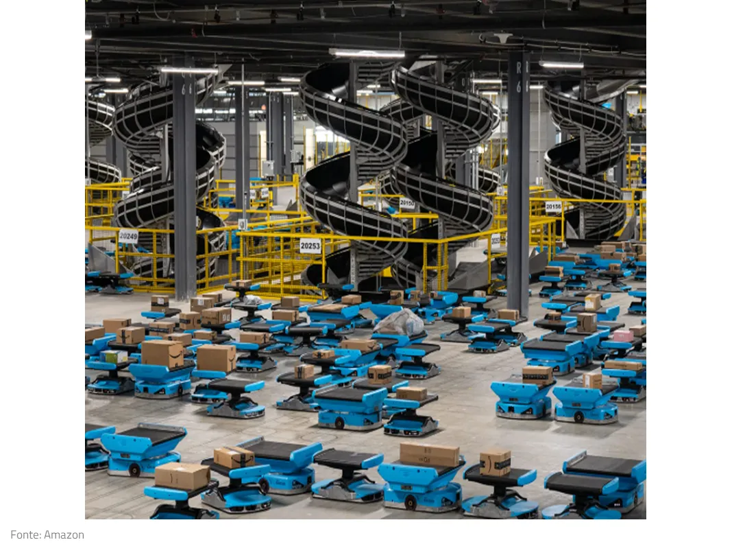 Para garantir essa maior produtividade, a Amazon foi aumentando gradualmente a proporção de robôs para funcionários nos armazéns: de 1 robô para cada 5 funcionários em 2017 para 1 robô a cada 1,2 funcionário em 2025.