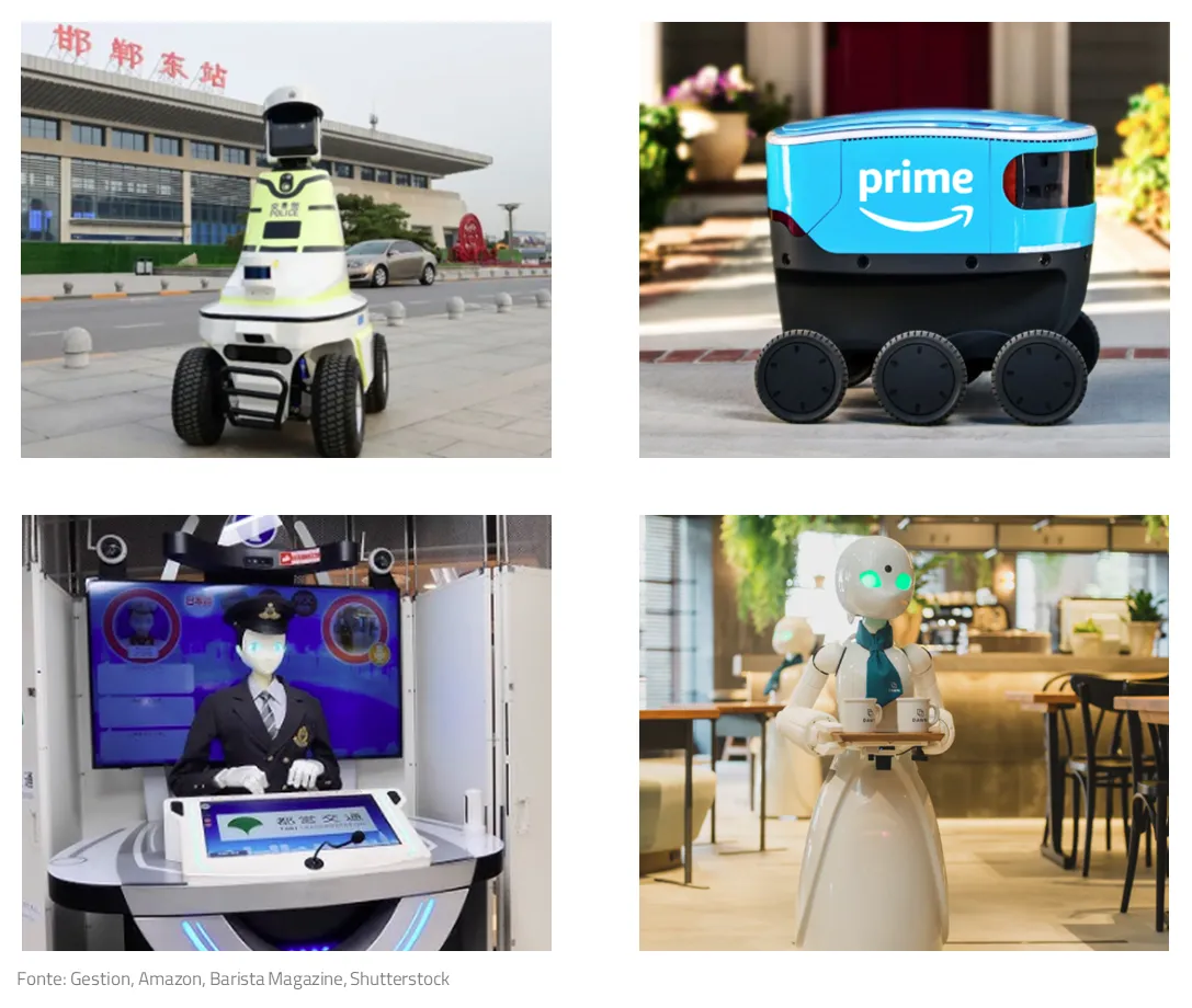 Além disso, em algumas cidades, principalmente na Ásia, já podemos ver robôs guardas de trânsito, robôs que realizam entregas, que respondem informações em estações de metrô, e que servem pratos em restaurantes.