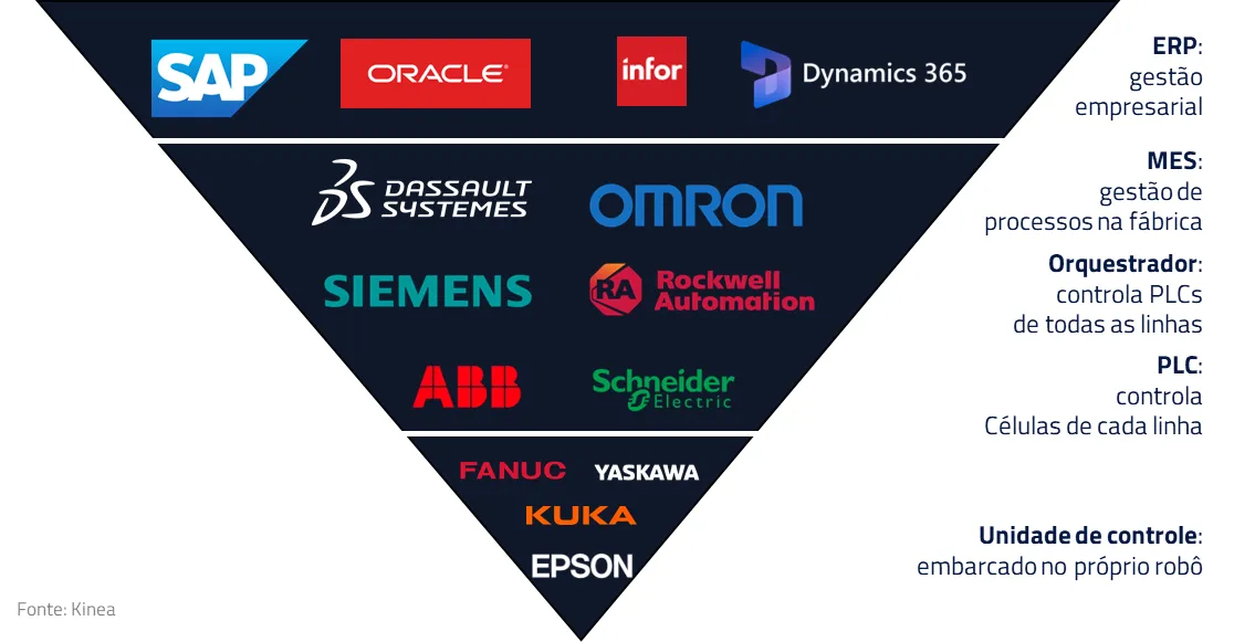 Além disso, é importante entender que um dos principais fatores para um robô ser mais flexível e inteligente é o software. As fábricas automatizadas têm softwares em diversas camadas, desde o ERP, até chegar no nível do robô. Atualmente, esse ecossistema é bastante fragmentado, em cada uma dessas camadas costuma-se ter fornecedores diferentes, que utilizam linguagens diferentes.