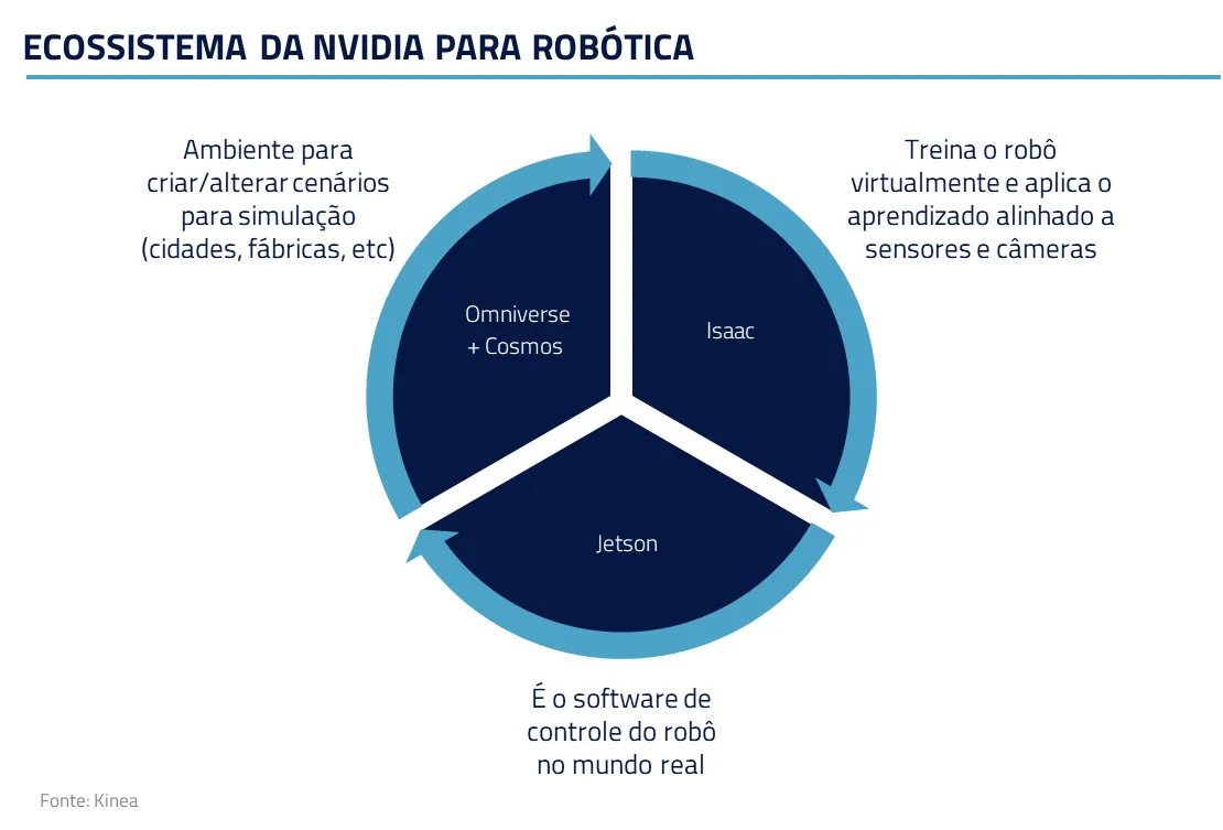 A NVIDIA é um dos principais players nesse segmento, com o ecossistema de software para simulação e treinamento (Omniverse e Isaac), e chips para computação embarcada (Jetson), a companhia está bem posicionada para capturar essa tendência de integração entre software e hardware em robótica.