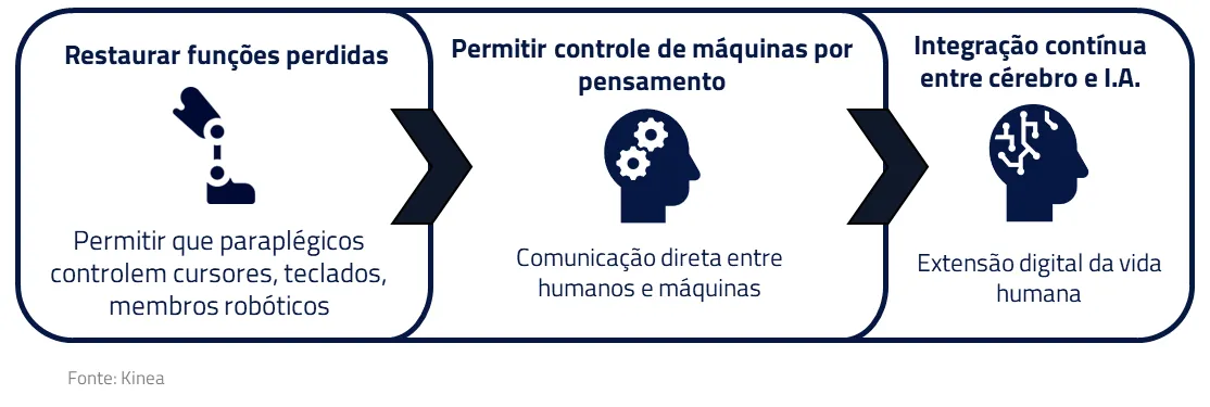 Enquanto isso, a Neuralink, empresa comandada por Elon Musk, também desenvolve essas interfaces cérebro-computador, mas com uma rota mais ambiciosa: o auxílio a pessoas com deficiência seria apenas o estágio inicial, mas o estágio final seria a contínua integração entre cérebro e máquina, iniciando a era da extensão digital da vida humana.