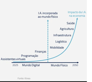 A materialização da I.A. (embodiment) é a etapa que permite o robô agir como um corpo, captando fótons (câmeras, LiDAR) e átomos (força, contato). Sem isso, a inteligência fica “desancorada”: sabe interpretar textos e imagens, mas não abre uma porta, não pega um saco plástico escorregadio e não aperta precisamente uma peça frágil. Grande parte do valor econômico está justamente em tarefas como essas, em que percepção, ação e feedback se fecham em um ciclo contínuo.