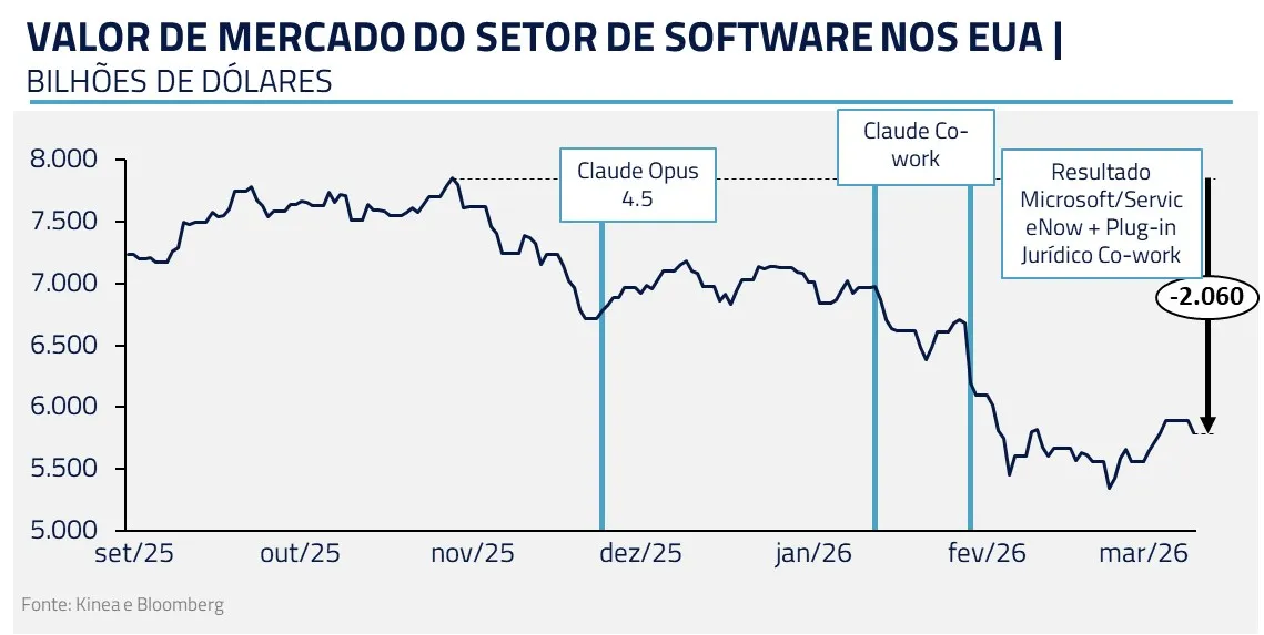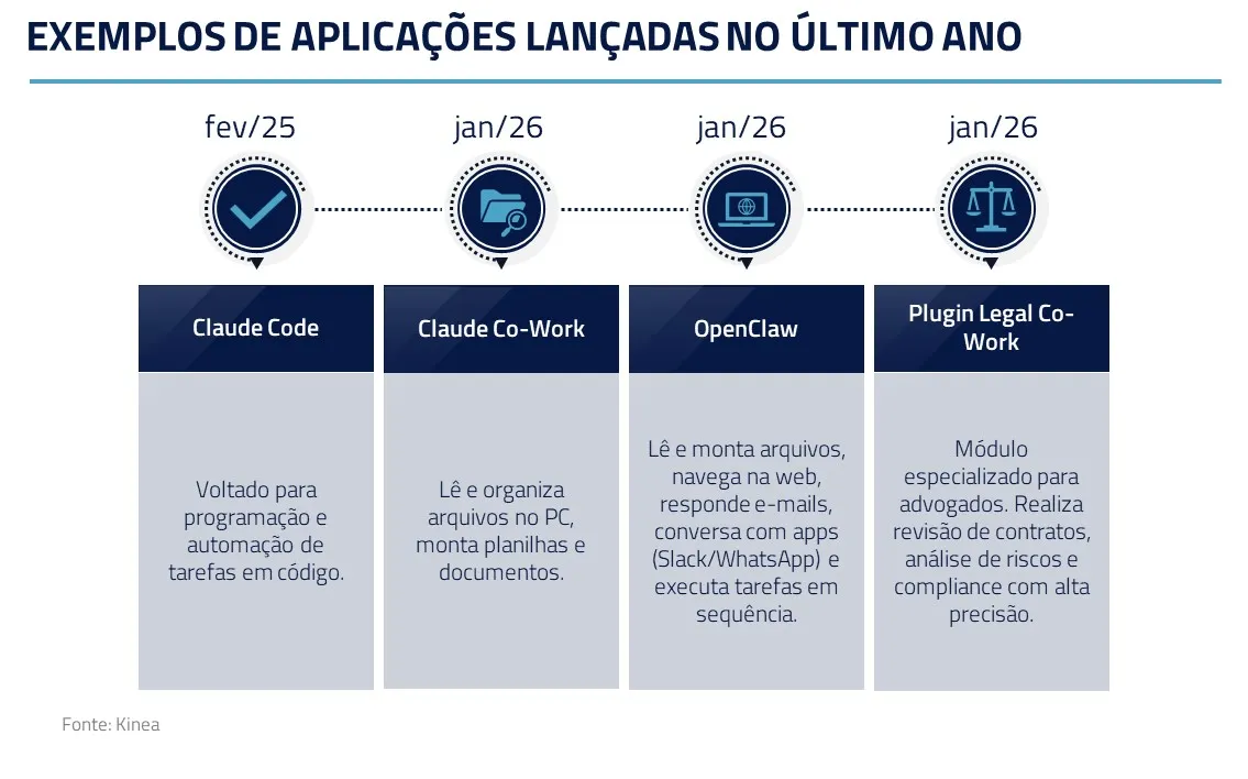 A velocidade do lançamento de soluções, como o Claude Co-Work, da Anthropic, fez o mercado questionar as barreiras de entrada das empresas de software: se times pequenos conseguem criar aplicações em poucas semanas, a vantagem das incumbentes pode ser menor.