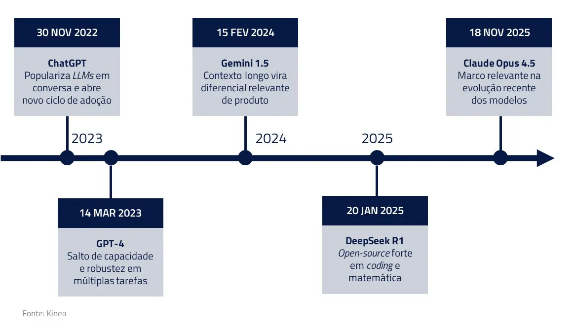 Os primeiros modelos LLMs tinham pouca utilização prática devido ao alto grau de alucinação, como o ChatGPT inicial. Após uma série de inovações tecnológicas, tais como cadeias de pensamento e aumento da janela de contexto, chegamos a um ponto de inflexão na utilidade dos modelos na forma de agentes. O Opus 4.5 da Anthropic no final de 2025 foi o exemplo mais claro dessa virada.