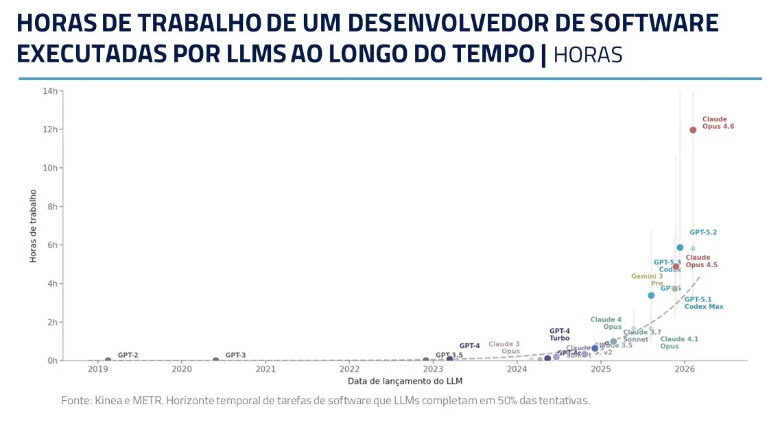 Atualmente, agentes de I.A. já conseguem realizar tarefas de complexidade equivalente a 10 horas de trabalho de um desenvolvedor de software júnior. Como comparação, o ChatGPT, quando lançado, conseguia fazer apenas o equivalente a poucos segundos de trabalho. No ritmo atual, em menos de dois anos os modelos serão capazes de realizar o trabalho que envolvem mais de uma semana de dedicação de um analista.