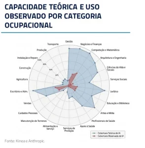 Na prática, porém, a adoção ainda está bem abaixo desse potencial. Mesmo em computação, a cobertura observada hoje é de cerca de 33% das tarefas. Segundo a Anthropic, esse descompasso reflete limitações técnicas, necessidade de supervisão humana, barreiras regulatórias, falta de integração com softwares e a própria lentidão de adoção pelas empresas.