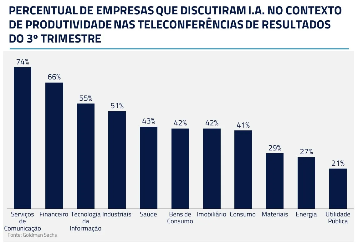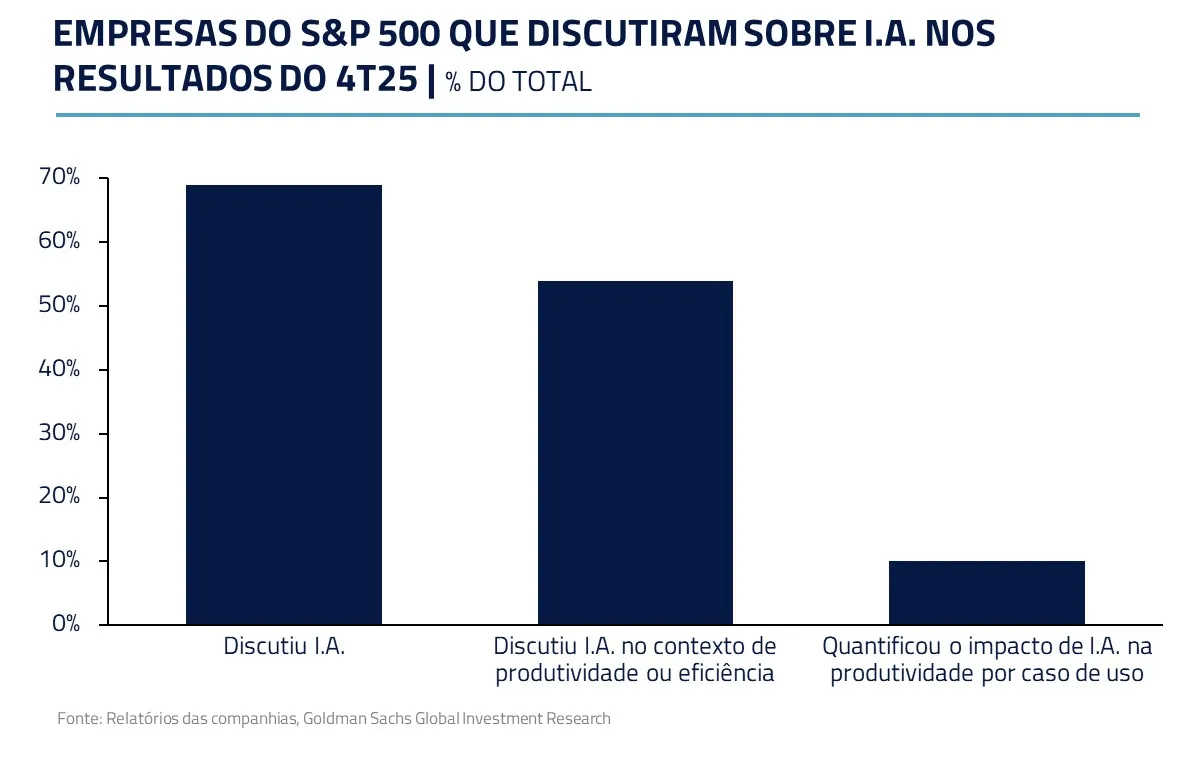 No entanto, o mundo corporativo já começou a se mover. O uso de agentes de I.A. tem aparecido com frequência crescente nas teleconferências de resultados de empresas americanas: 50% das companhias já mencionaram ao menos uma iniciativa e o tema hoje atravessa todos os setores do S&P 500.