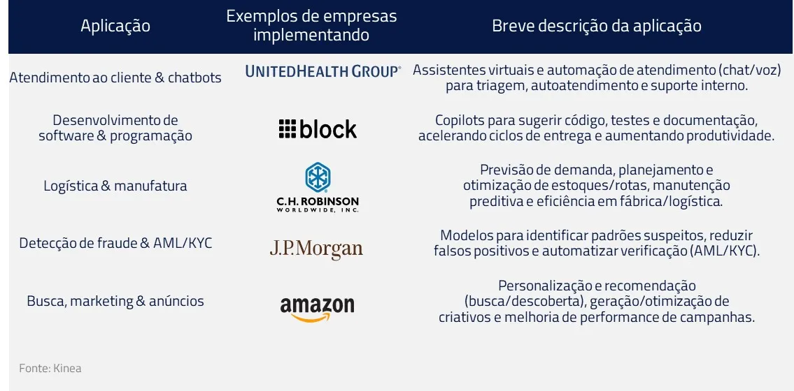 Além dos setores acima, conforme descrevemos nas seções anteriores, consideramos atraente investir em líderes setoriais que devem ampliar suas vantagens competitivas via I.A., como no caso da Amazon e J.P. Morgan. No caso das empresas de software, acreditamos que existirão vencedores e perdedores dentro desse processo, e nossa preferência é por empresas que devem acelerar a adoção de I.A. no mundo corporativo, como no caso da Snowflake.