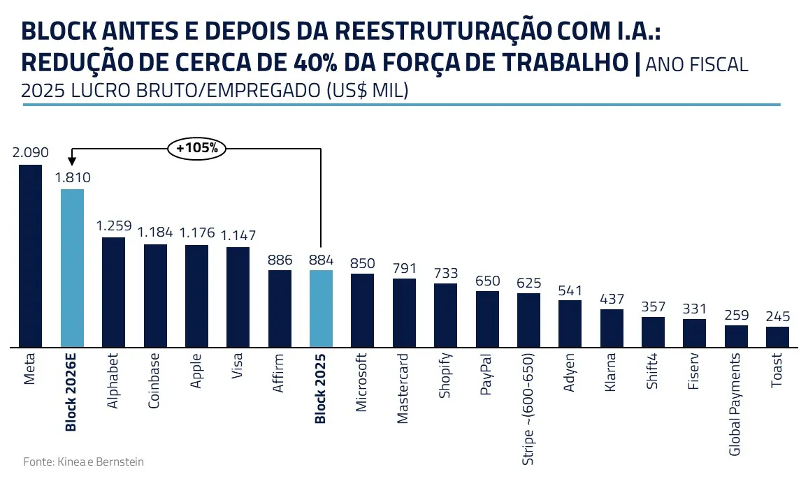 Essa redução não veio somente por pressão de custos. A Block, apesar das elevadas contratações no pós-covid, apresentou lucro bruto por funcionário crescente desde 2022, atingindo o maior nível de sua história. Além disso, quando olhamos para essa métrica em relação a outras empresas de tecnologia vemos que a empresa não estava aquém de seus pares, o que corrobora que, de fato, a produtividade de seus funcionários tem aumentado com os agentes de I.A.