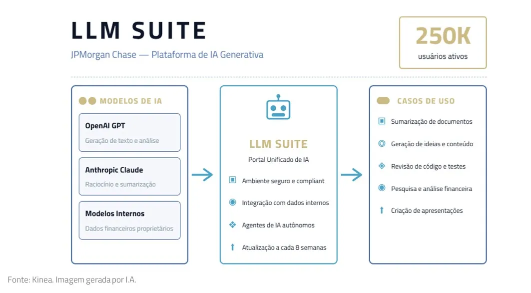 Lançada em 2024 como plataforma interna, a LLM Suite, que integra modelos de linguagem da OpenAI e da Anthropic, alcançou 250 mil funcionários globalmente. A plataforma consegue criar apresentações para a área de banco de investimento em poucos segundos, enquanto analistas júniores levariam horas para executar a mesma tarefa.