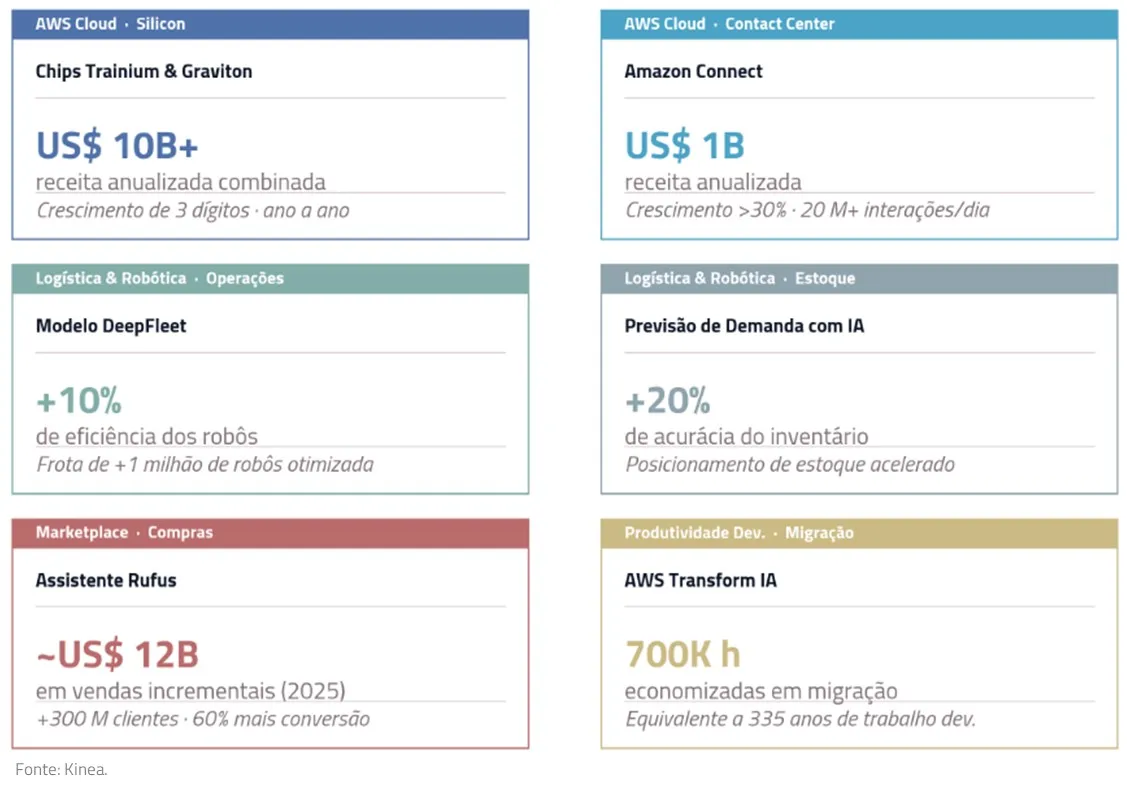 A Amazon, líder de e-commerce no Ocidente, além de ser provedora de infraestrutura de cloud para agentes de I.A., está embutindo agentes em todas as camadas do negócio simultaneamente. O assistente de compras Rufus, alimentado por I.A., gerou mais de 10 bilhões de dólares em vendas em 2025.