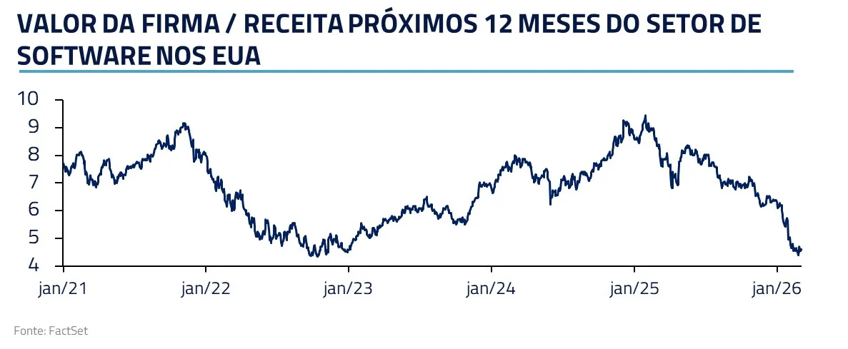 Não foi o caso de carros a combustão deixarem de ser vendidos da noite para o dia; foi que o mercado passou a projetar fluxos de caixa futuros estruturalmente menores. O mesmo fenômeno se repete agora em software. Empresas como Adobe e Salesforce não estão quebrando, seguem gerando caixa e têm clientes fiéis. Mas, quando o mercado olha dez anos à frente e vê agentes comprimindo licenças e substituindo categorias inteiras de produto, o valor terminal simplesmente encolhe.