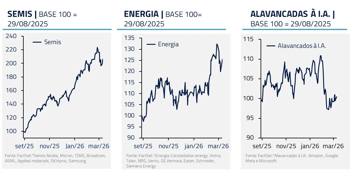 Segundo elo: semicondutores. A infraestrutura de semicondutores é o gargalo estrutural. Empresas de equipamentos para fabricação de chips, a capacidade produtiva concentrada em players como a TSMC e designers líderes como Nvidia e Google formam a espinha dorsal do ecossistema. Não competem com os agentes, tornam sua existência possível.