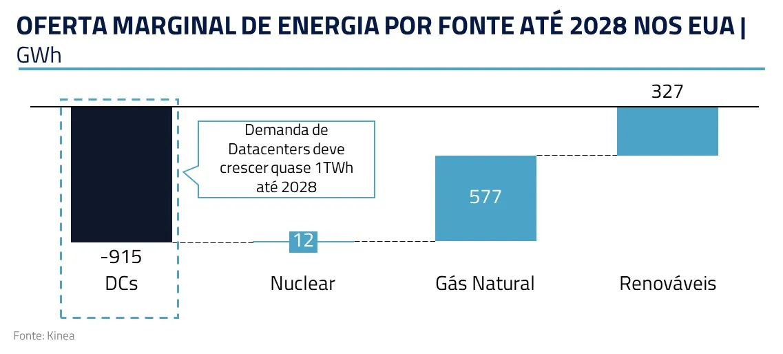 Primeiro elo: energia. Modelos consomem tokens; tokens consomem eletricidade. A expansão da oferta elétrica é condição necessária para que a computação avance no ritmo atual. Todas as fontes de energia estão sendo contratadas pelos data centers, com prioridade para nuclear e gás, cuja cadeia de fabricação de turbinas já se encontra rodando no limite de capacidade. Mais recentemente, as fontes renováveis também voltaram ao páreo em função de sua rápida escalabilidade e pelo desenvolvimento dos sistemas de baterias. Sem energia abundante, não há multiplicação de agentes.