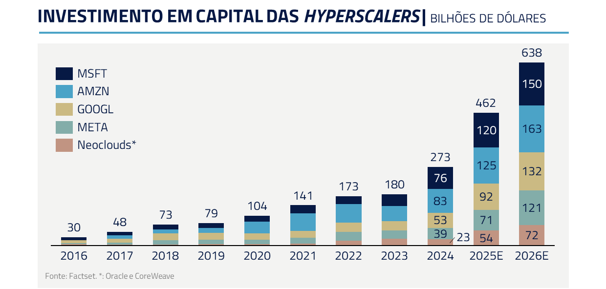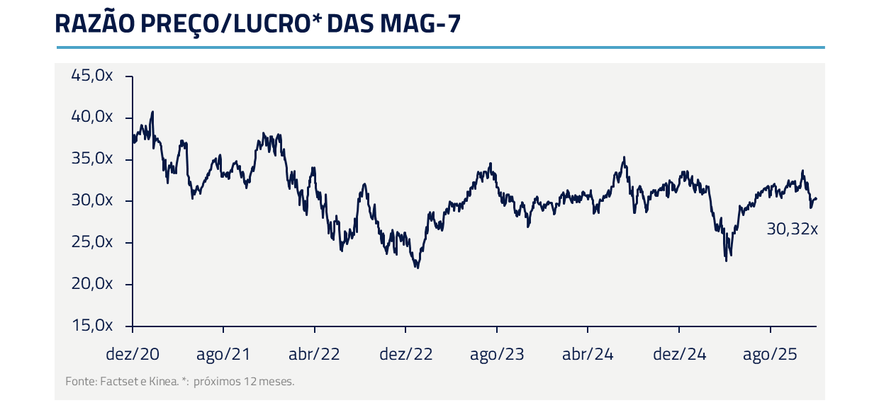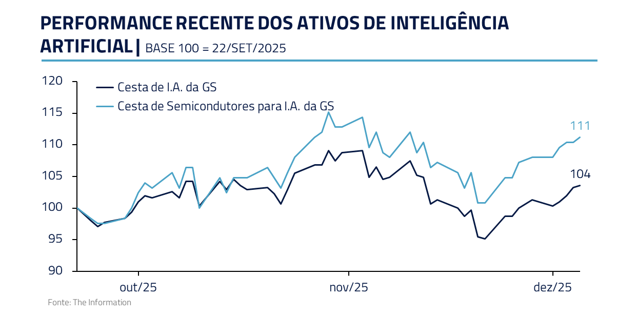 E, apesar da narrativa de bolha, a Nasdaq sobe modestos 22% no ano. O ímpeto inicial deu lugar a uma leitura mais sóbria dos fundamentos: o que se questiona não são os múltiplos que essas empresas negociam, mas sim quais delas deverão gerar crescimento de receita que justifique os elevados investimentos até o momento.
