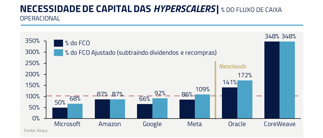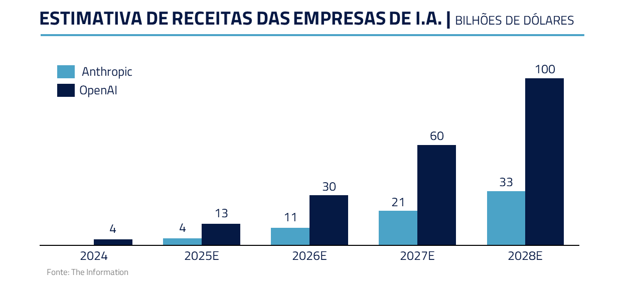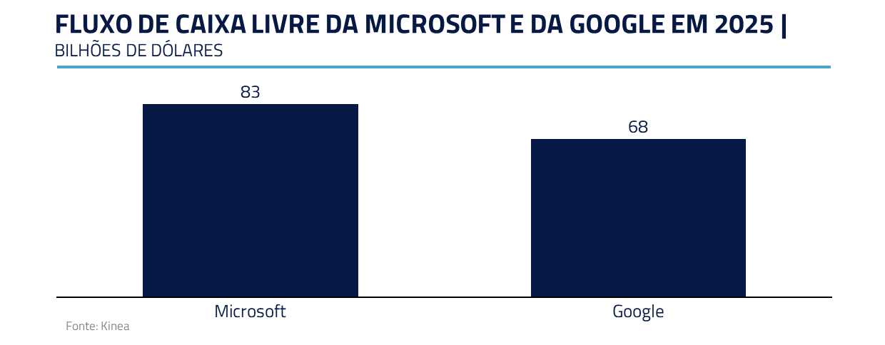 Contrastando com esses casos, Microsoft e Google financiam a expansão em I.A. com geração própria de caixa. Além disso, ao contrário de Oracle e CoreWeave, provedores de infraestrutura, ambos contam com canais de distribuição únicos, o que acelera a monetização.