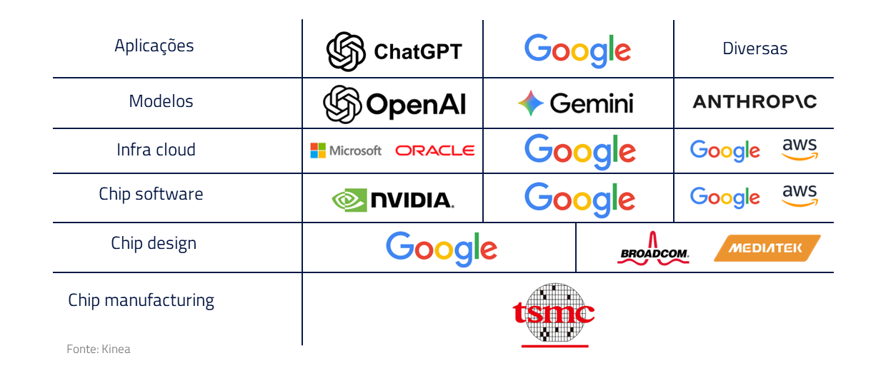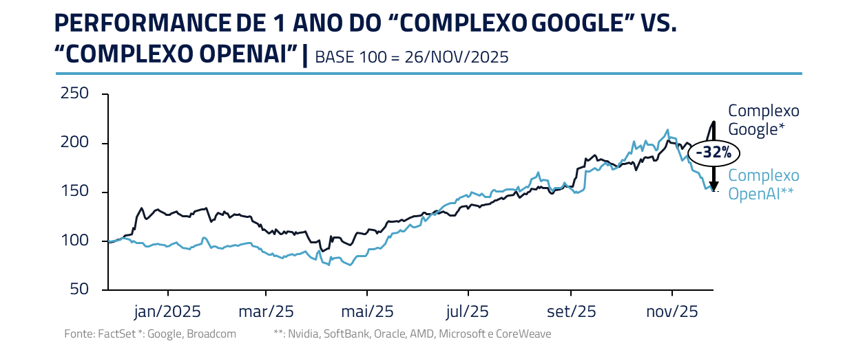 Paralelamente, muitas empresas de infraestrutura ligadas à OpenAI também não conseguiram manter o ritmo de valorização. O Google, em contrapartida, assumiu de vez a liderança tecnológica e, da mesma forma que os parceiros da OpenAI sofreram nesse período, os do Google apresentaram forte valorização.