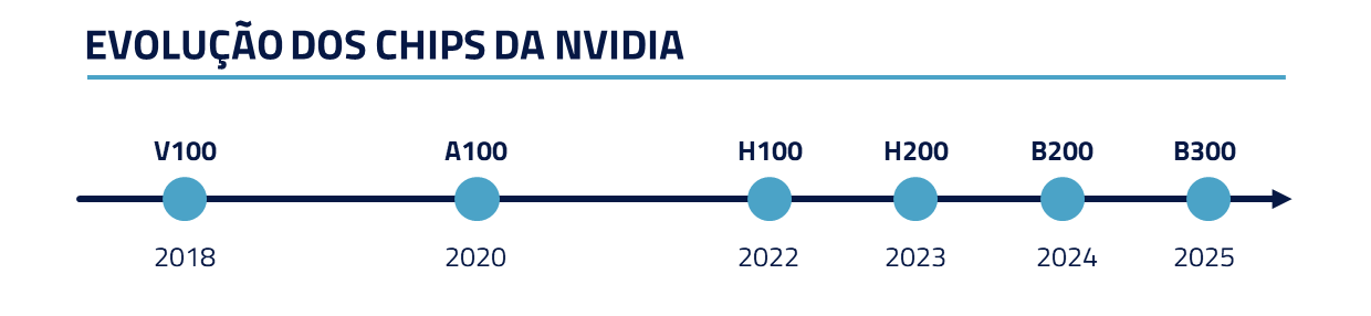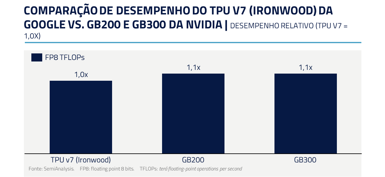 Dentro desse cenário competitivo, é importante considerarmos que a recente vantagem competitiva da Google foi consequência, em parte, da eficiência de seus chips (TPU) em relação à geração anterior de chips da Nvidia (Hopper).