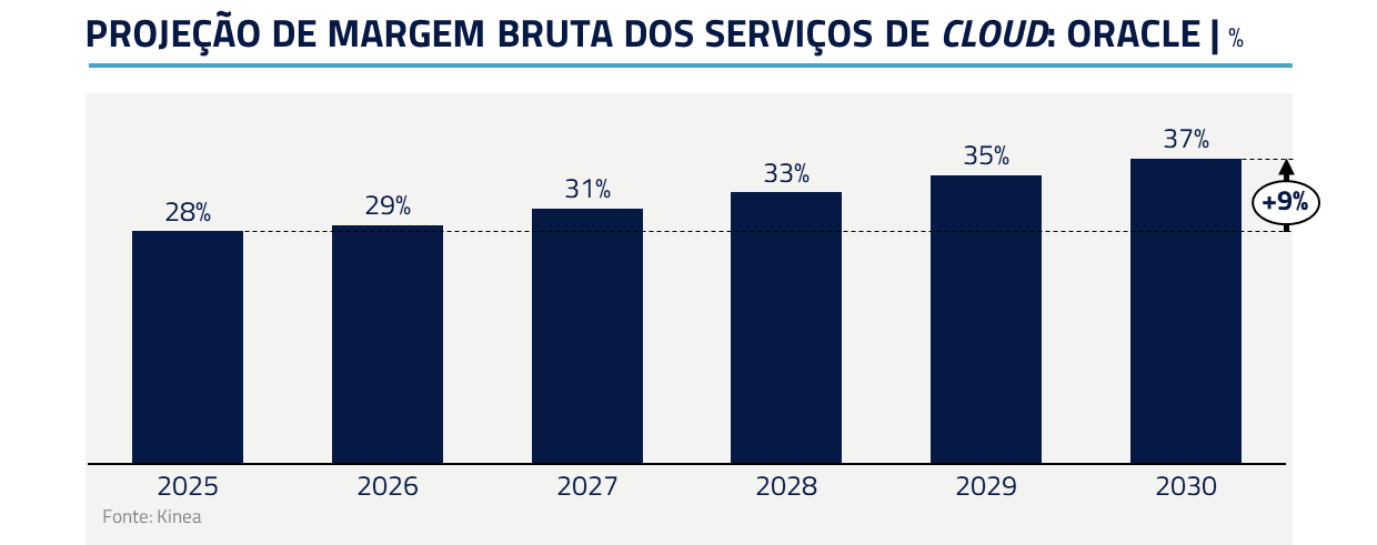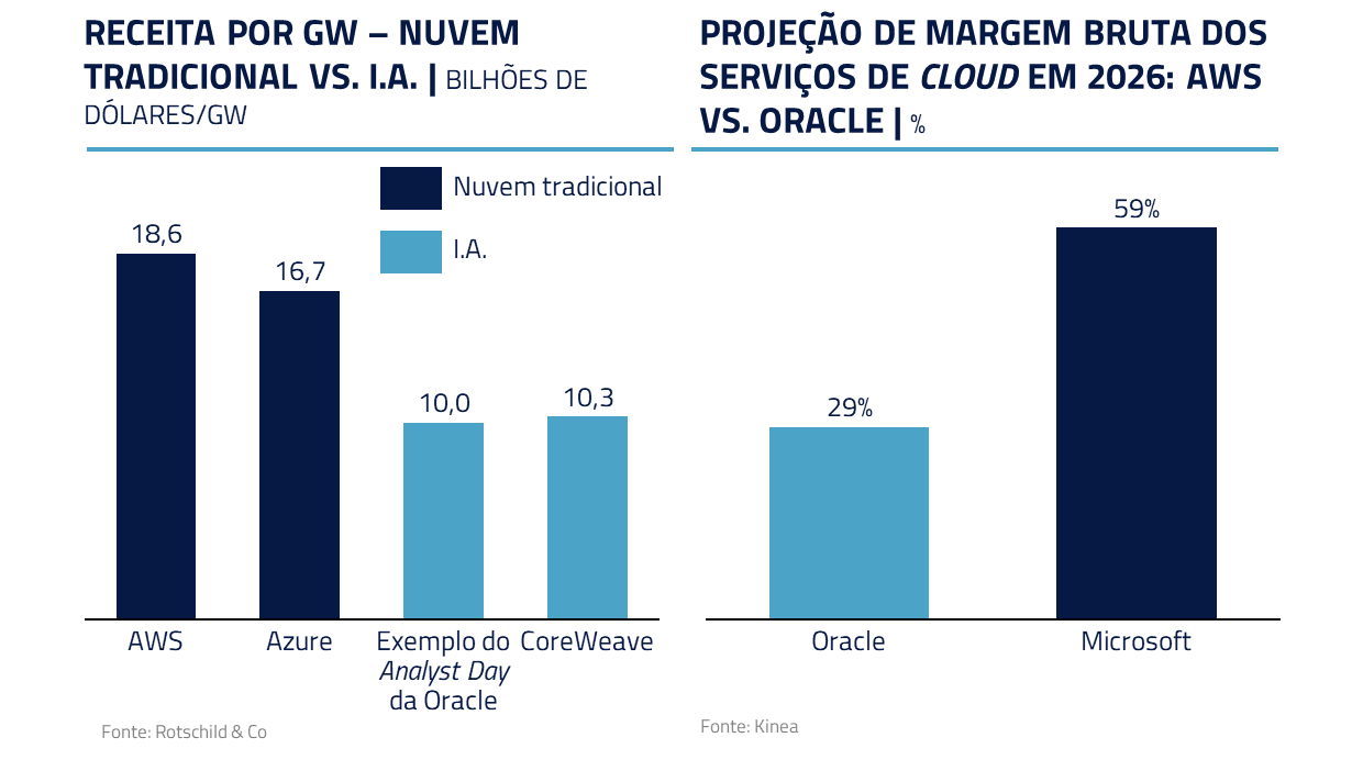 Em nossa visão, a estratégia parece ser oferecer capacidade bruta de I.A. a preços competitivos agora para, depois, capturar valor nas camadas superiores (bancos de dados e outros softwares). Mesmo com margens iniciais menores, espera-se que a escala e a eficiência elevem a rentabilidade. Além disso, há opcionalidade e posicionamento estratégico: tratar a I.A. como território a conquistar, aceitando retornos mais baixos no curto prazo para garantir presença em um mercado de crescimento secular.