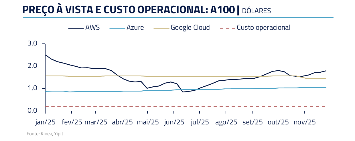 Quando olhamos dados do setor, vemos bons argumentos em favor da empresa. Continuamos vendo os chips A100 sendo locados a valores superiores a US$ 1 por hora, valor muito superior ao custo operacional estimado de US$ 0,20-0,30 por hora.