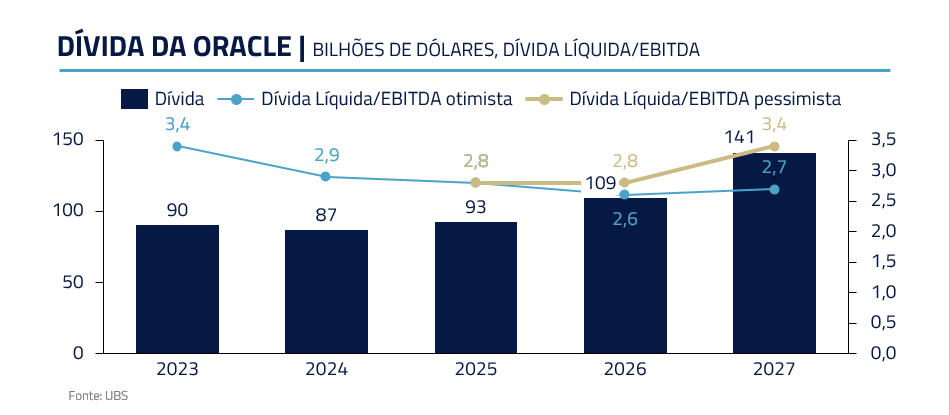 A Oracle, tradicional em software corporativo e bancos de dados, viu na I.A. em nuvem uma chance de reinvenção: firmou um megacontrato para fornecer infraestrutura à OpenAI e iniciou a construção de grandes data centers. Para viabilizar essa empreitada, emitiu US$ 18 bilhões em novas dívidas em setembro e pode precisar levantar até US$ 100 bilhões adicionais nos próximos anos, uma alavancagem expressiva para uma empresa do seu porte.