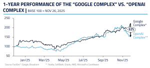 In parallel, many infrastructure companies linked to OpenAI also failed to sustain the pace of appreciation. Google, by contrast, has firmly established technological leadership and, just as OpenAI’s partners struggled over this period, Google’s partners posted strong gains.