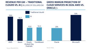 In our view, the strategy appears to be to offer raw AI capacity at competitive prices now and, later, capture value in the upper layers (databases and other software). Even with initially lower margins, scale and efficiency are expected to lift profitability. In addition, there is optionality and strategic positioning: treating AI as territory to be conquered, accepting lower near‑term returns to secure a foothold in a secular growth market.