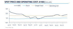 When we look at industry data, we find strong arguments in favor of the company. We continue to see A100 chips rented at rates above US$1 per hour, a level well above their estimated operating cost of US$0.20–0.30 per hour.